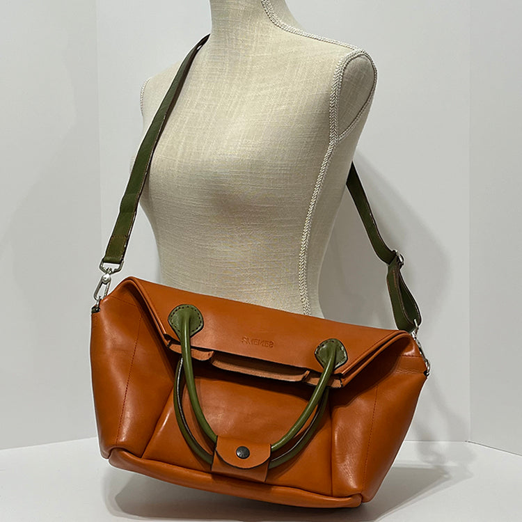 features | versatility as a handbag, shoulder tote or crossbody. exterior back zipper access, handles fold inward to create smaller crossbody and/or clutch style